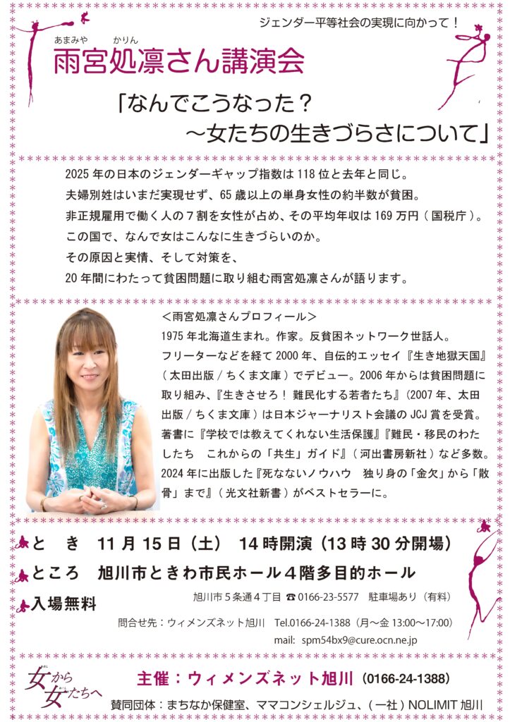 2025年10月23日 / 最終更新日時 : 2025年10月23日 staff01 未分類 雨宮処凛さん講演会 雨宮処凛さんの講演会を行います。雨宮さんの生の声を聞くことができる貴重な機会です。ぜひ、多くの方のご参加をお待ちしています。「女の生きづらさ」だけでなく、今の「私たちの生きづらさ」についてお話いただきます。 コメントを残す コメントをキャンセルメールアドレスが公開されることはありません。 ※ が付いている欄は必須項目ですコメント ※ 名前 ※ メール ※ サイト 次回のコメントで使用するためブラウザーに自分の名前、メールアドレス、サイトを保存する。 Δ